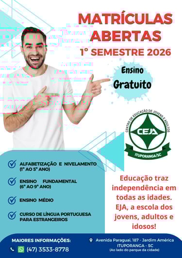 No CEJA de Ituporanga, acreditamos que nunca é tarde para aprender. Concluir a educação básica significa abrir portas para novas oportunidades profissionais, ingresso no ensino superior e conquistas pessoais.