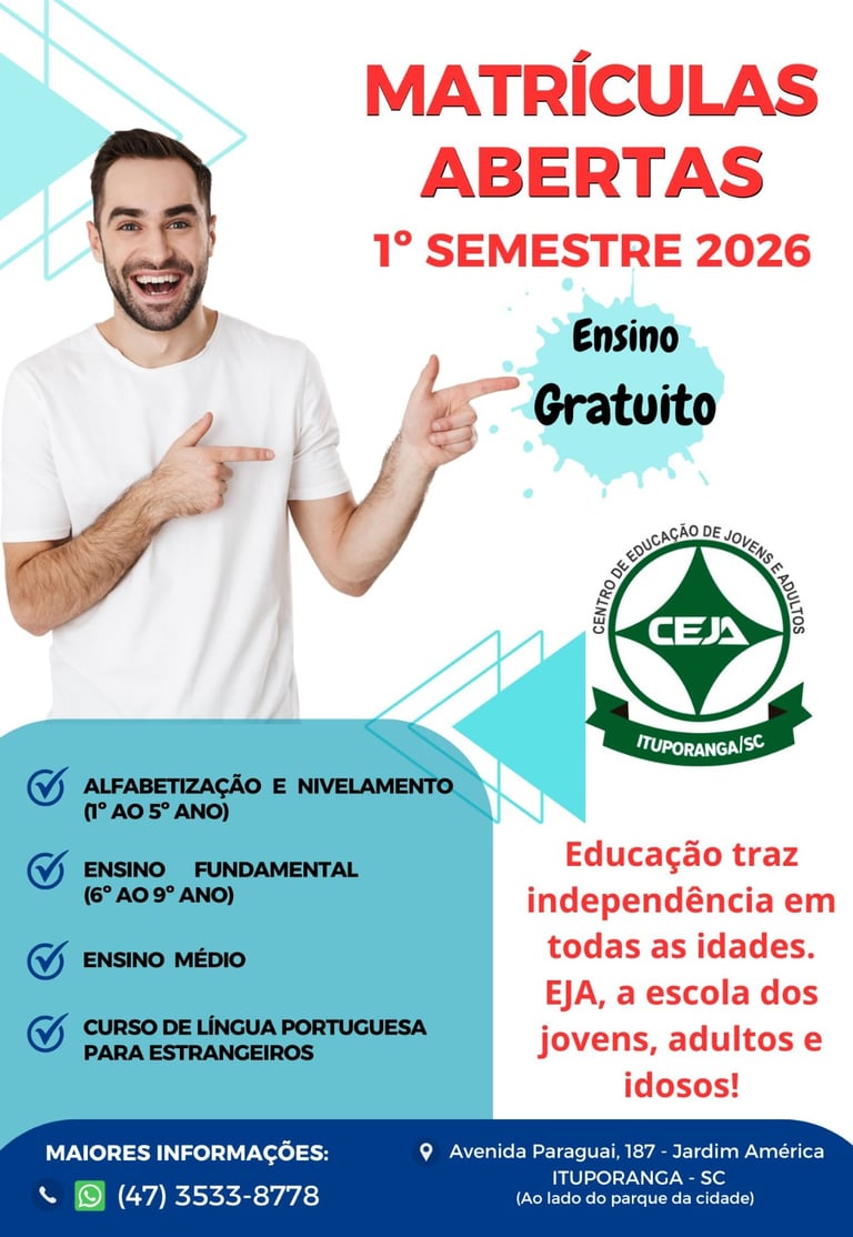O CEJA de Ituporanga oferece a oportunidade de conclusão da Educação Básica para jovens, adultos e idosos que não puderam finalizar seus estudos na idade adequada. Nosso objetivo é valorizar cada trajetória de vida e garantir o direito à educação de forma acessível e flexível.