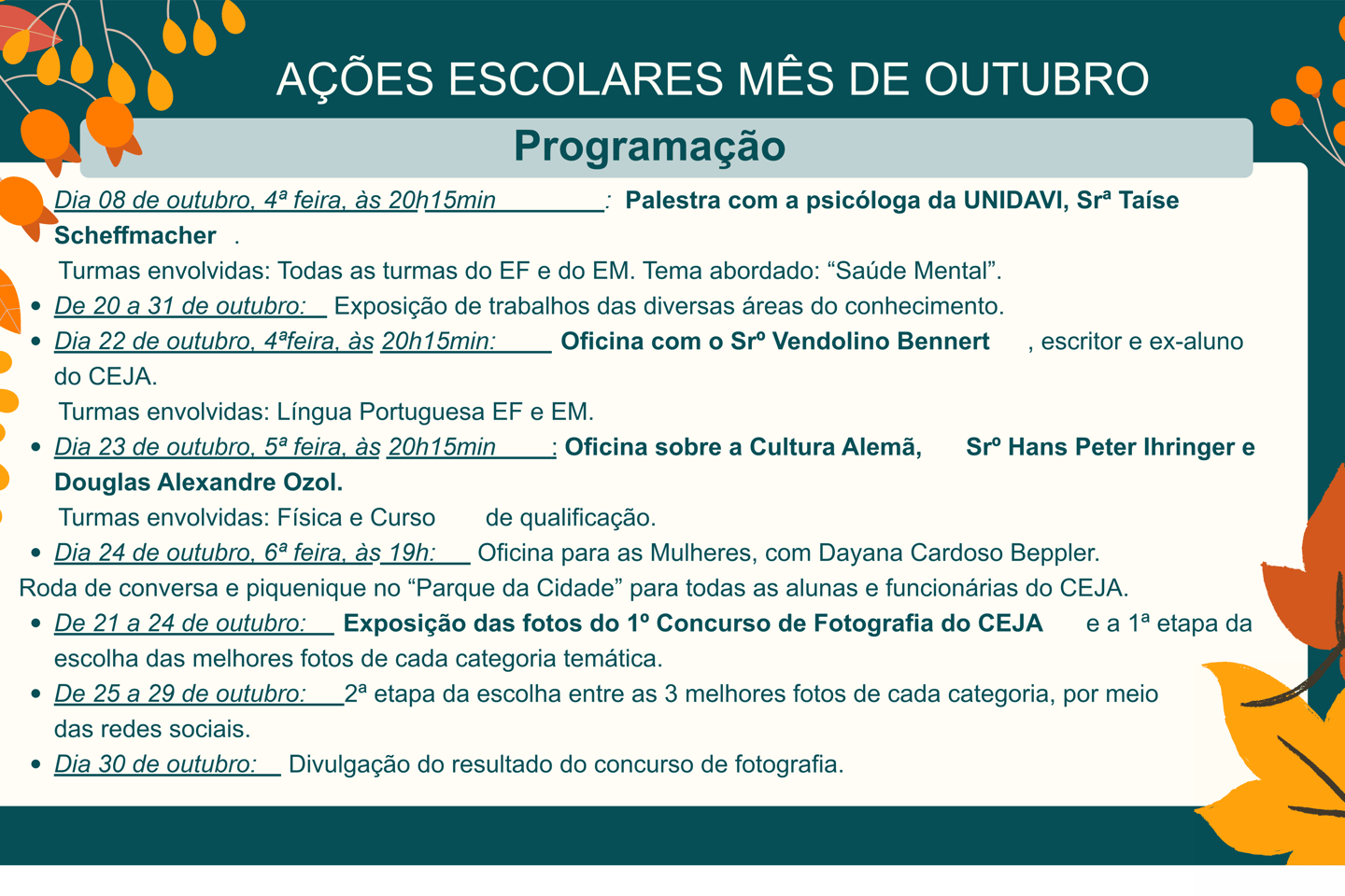 O CEJA de Ituporanga oferece a oportunidade de conclusão da Educação Básica para jovens, adultos e idosos que não puderam finalizar seus estudos na idade adequada. Nosso objetivo é valorizar cada trajetória de vida e garantir o direito à educação de forma acessível e flexível.